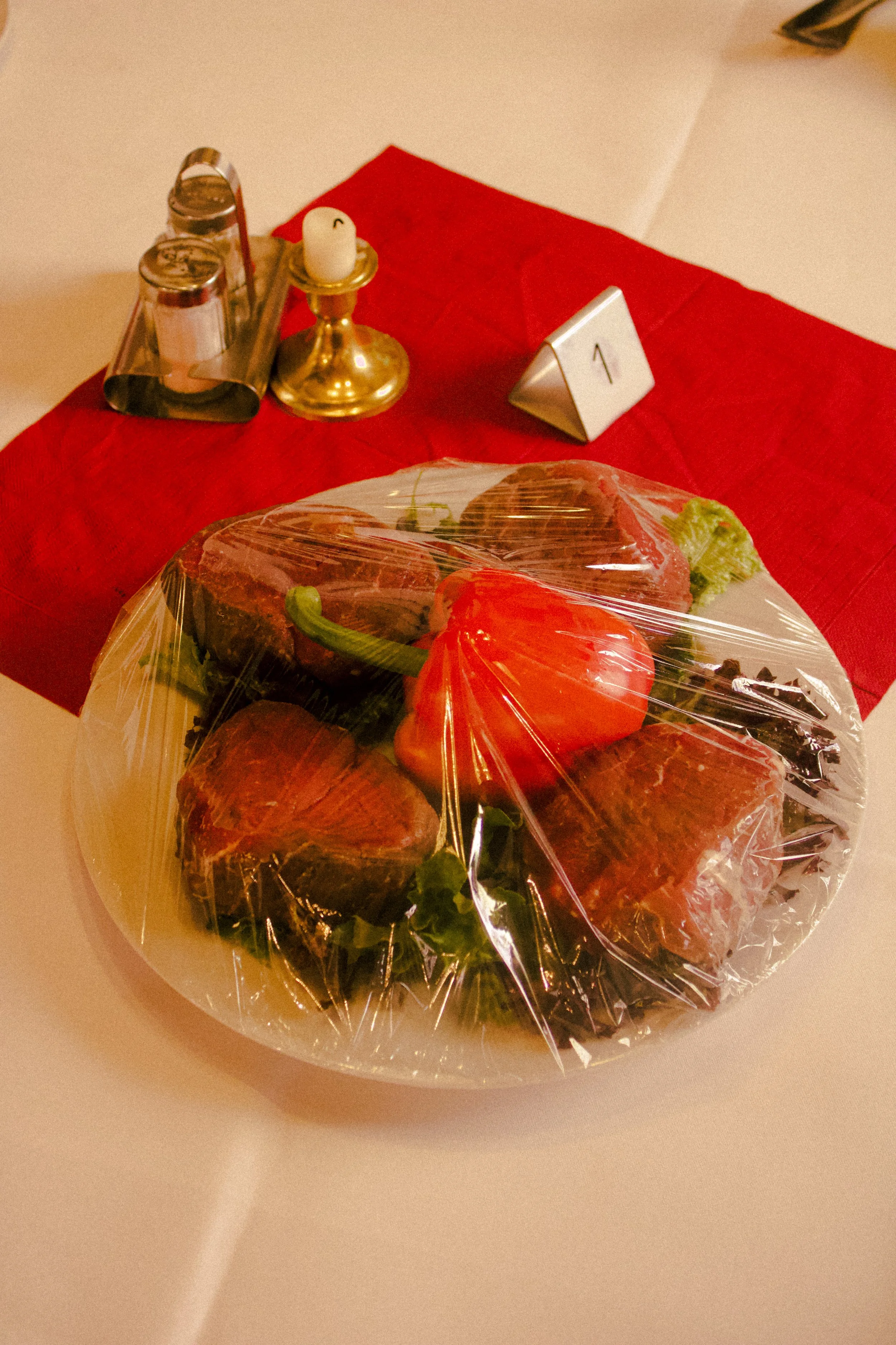 Teller mit rohem Fleisch und Paprika, mit Frischhaltefolie abgedeckt, auf einem Tisch mit roter Serviette, Salz- und Pfefferstreuer, Kerze und Tischkarte. Im Vollbildmodus anzeigen