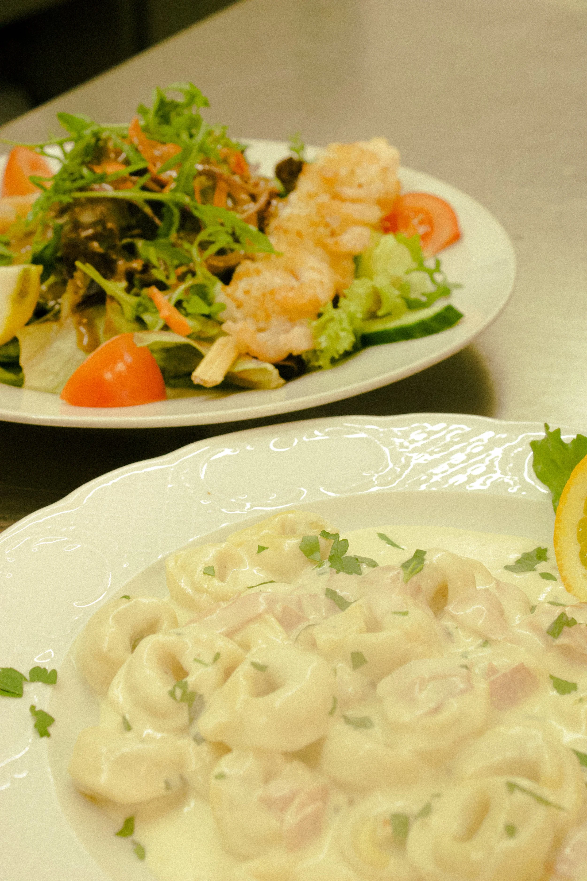 Nahaufnahme von gefüllter Tortellini-Pasta in Sahnesauce auf einem Teller, dekoriert mit Petersilie und einer Zitronenscheibe. Im Hintergrund befindet sich ein Teller mit gemischtem Salat und frittierten Garnelen.