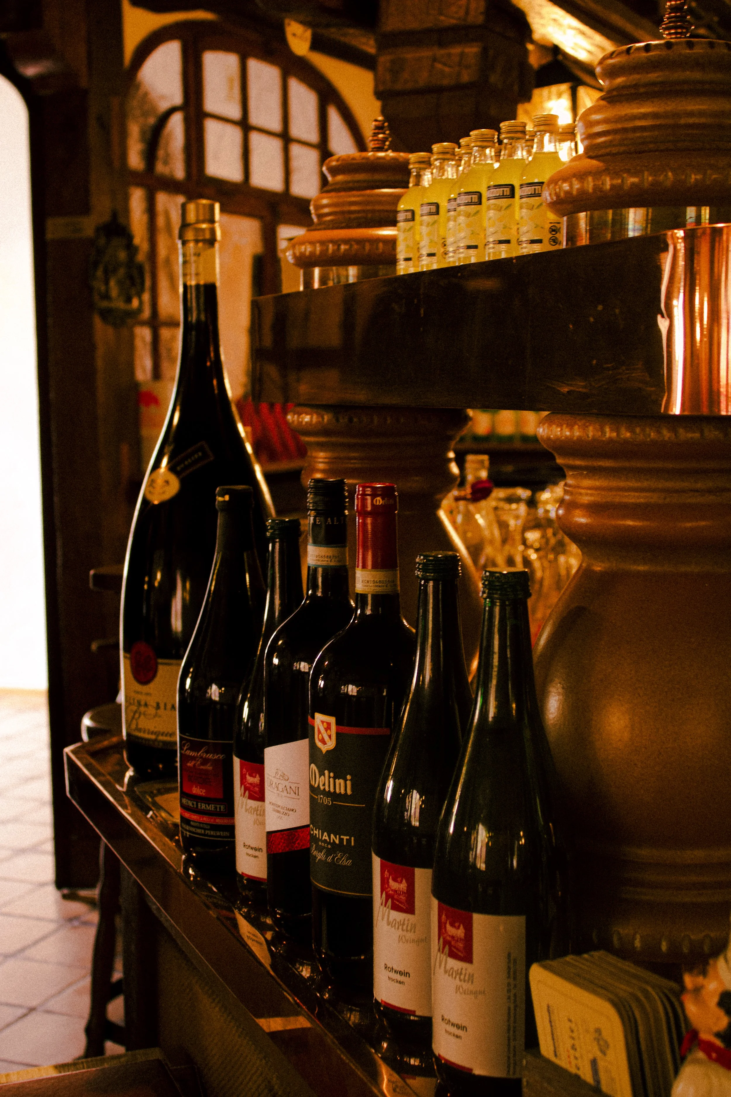 Reihe von Weinflaschen und Limonadenflaschen auf einem Holztresen in einem rustikalen Restaurant.