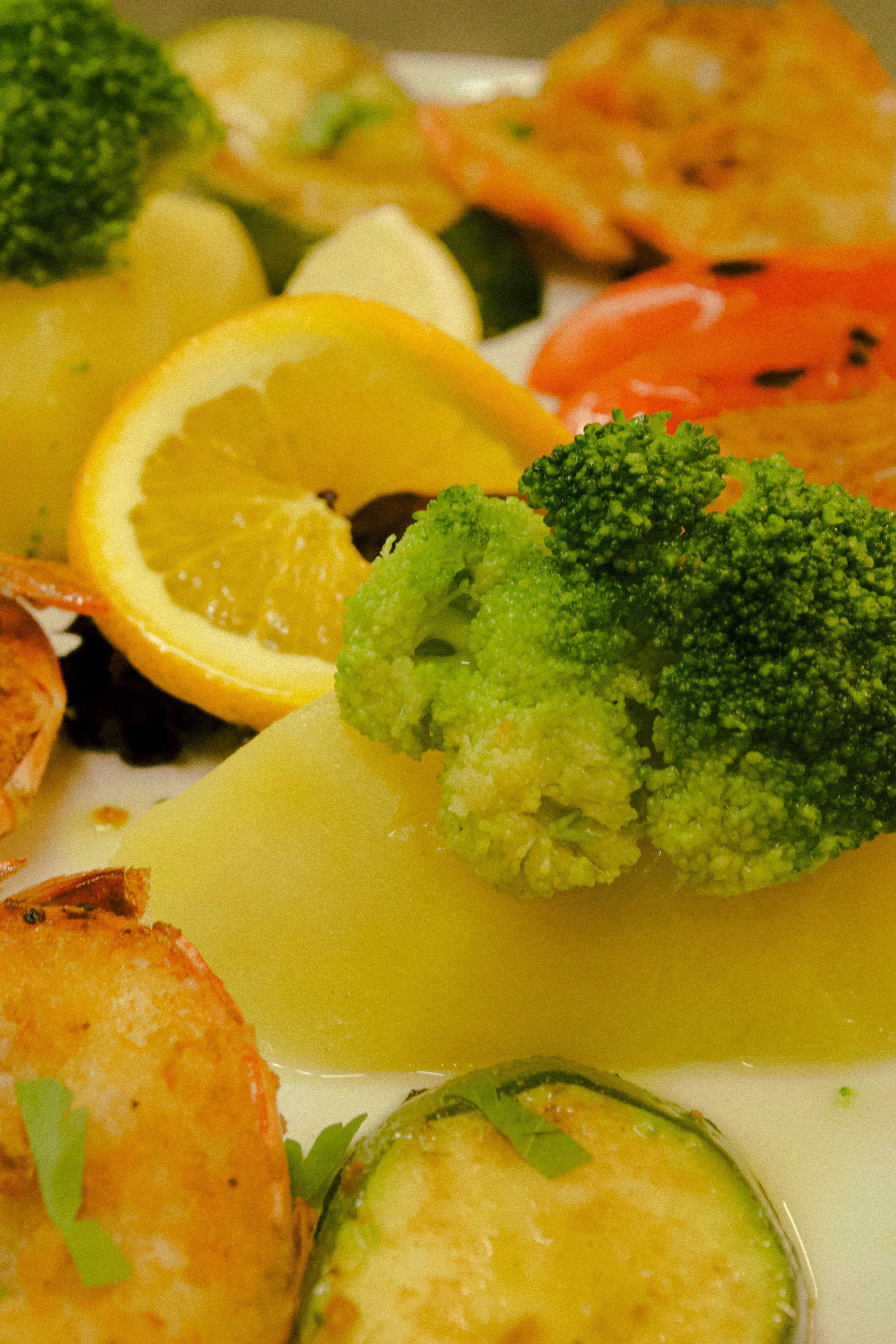 Nahaufnahme eines Gemüsetellers mit Brokkoli, einer Limetten- oder Zitronenscheibe, Zucchini und Paprika.