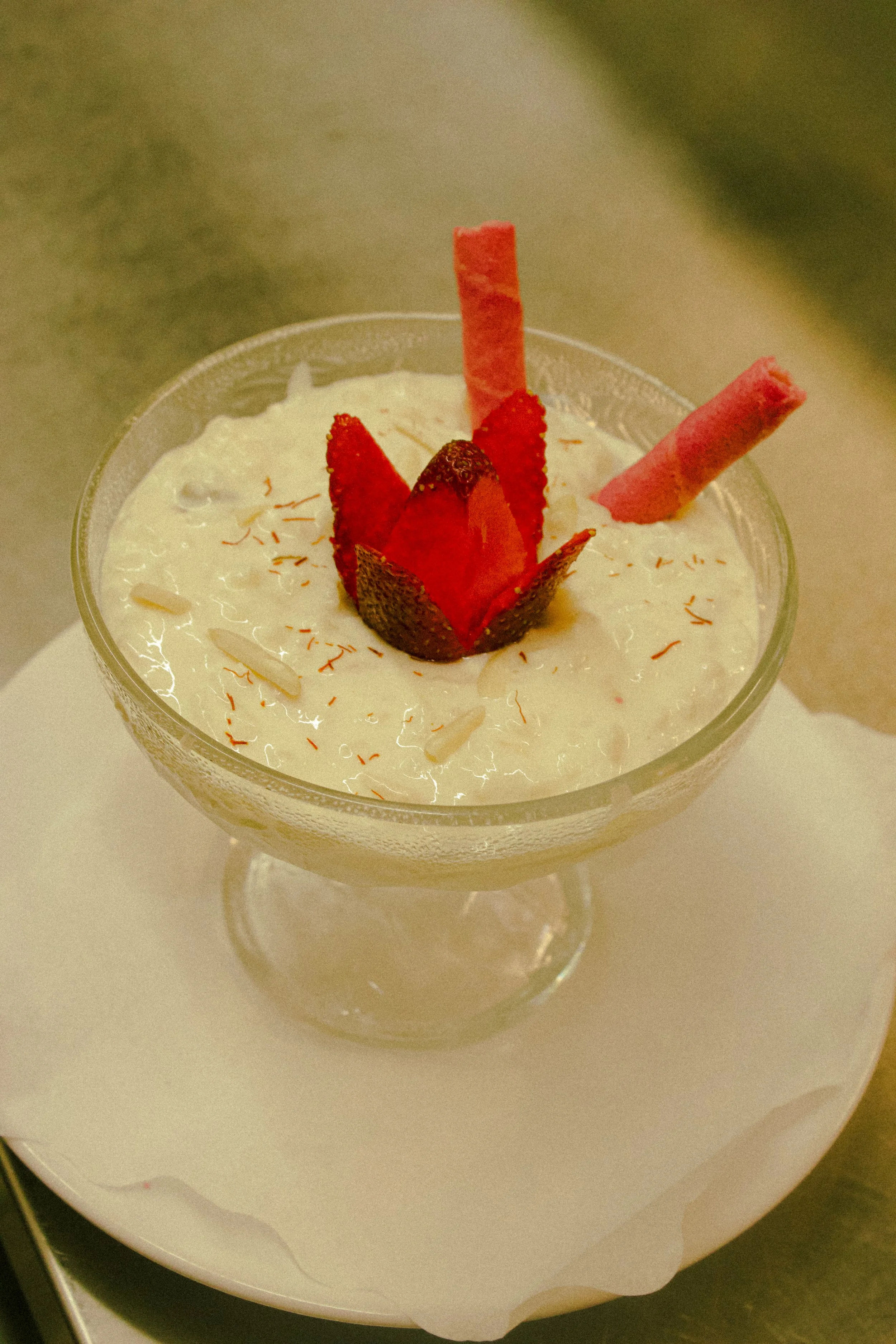 Ein Glas mit einem cremigen Dessert, garniert mit Erdbeeren, roten Dekorationsröllchen und feinen Fäden, möglicherweise Safran.
