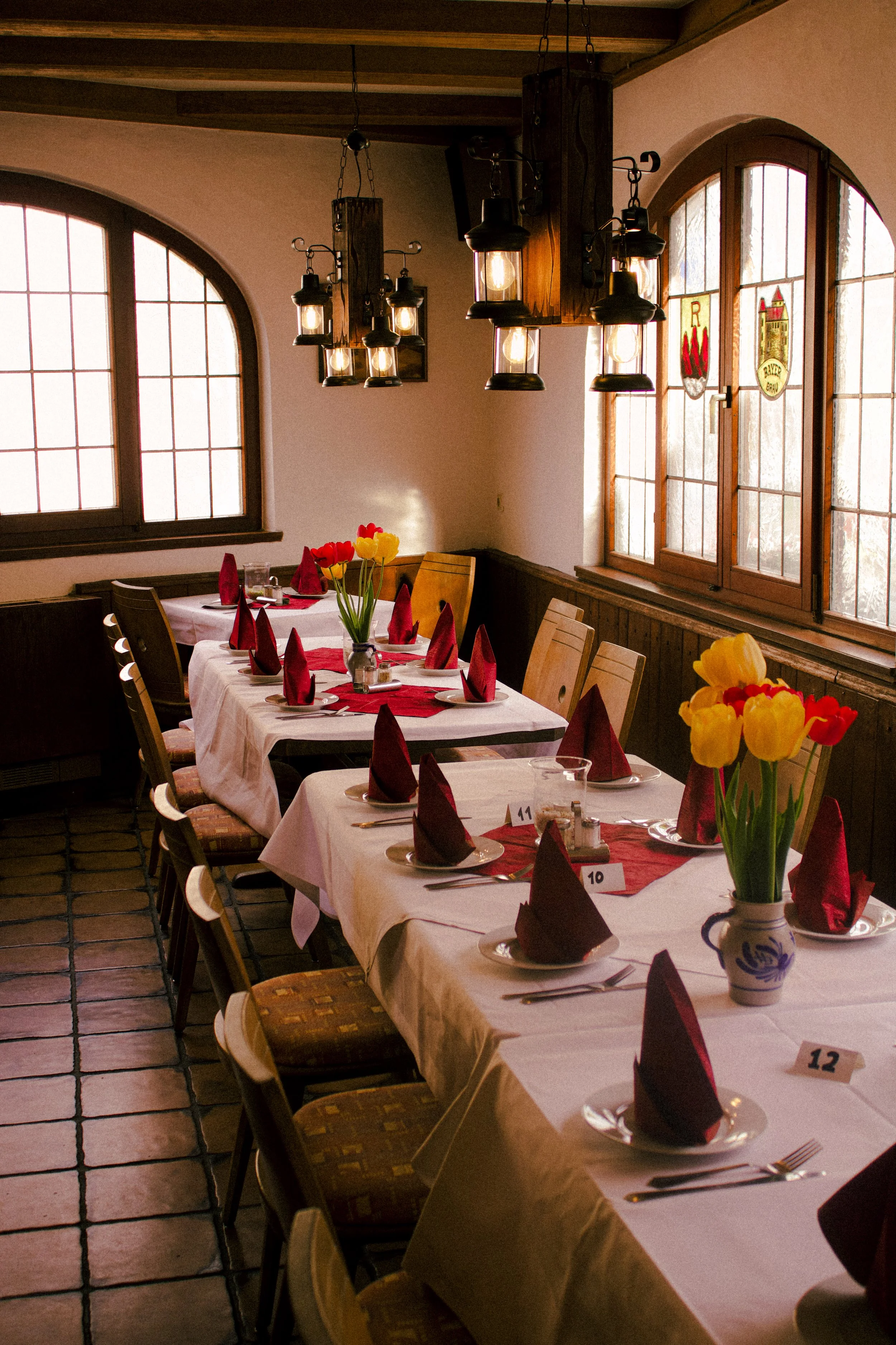 Ein langer Tisch in einem traditionellen Restaurant ist für ein Essen gedeckt. Auf dem Tisch befinden sich weiße Tischdecken, rote Servietten, Blumen in einer Vase, Besteck und Geschirr. Runde Lampen hängen von der Decke. Die Atmosphäre wirkt warm un Im Vollbildmodus anzeigen