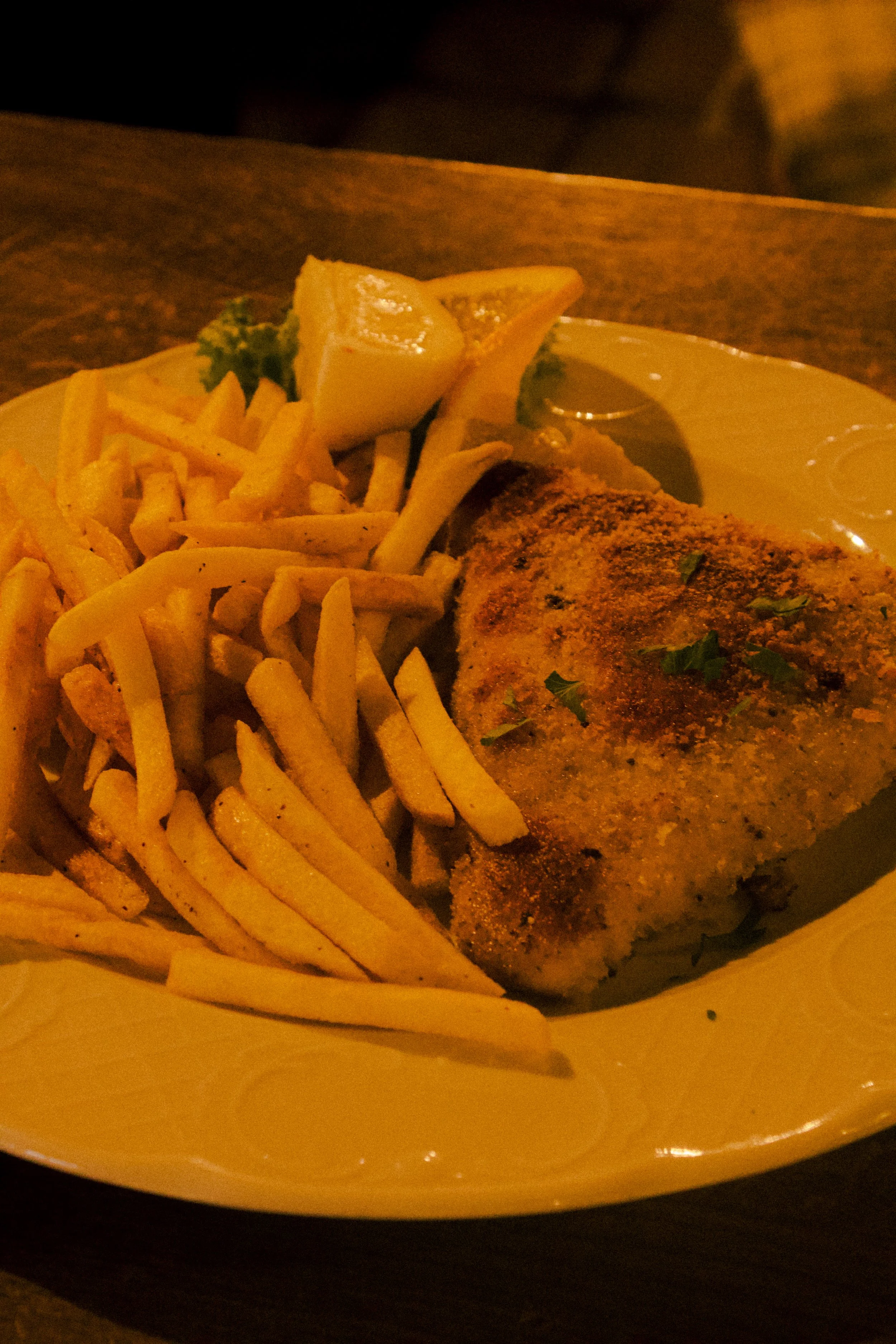 Ein Teller mit Pommes Frites und einem panierten Schnitzel, garniert mit einer Zitronenscheibe. Im Vollbildmodus anzeigen
